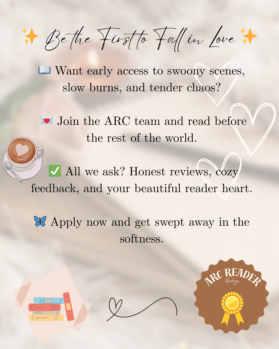 ✅ All we ask? Honest reviews, cozy feedback, and your beautiful reader heart.🦋 Apply now and get swept away in the softness.